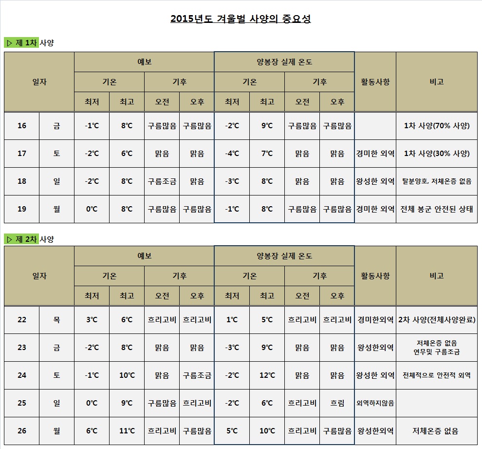 ¡Ø4, »ç¾çÀ» ÇßÀ»¶§ ²Ü¹úÀÇ »ý¸®Àû ÀÛ¿ë : Àü³âµµ °¡À»³» ²Ü°ú ¿ùµ¿»ç¾çÀ¸·Î ÀúÀåµÈ ½Ä·® À§ÁÖ·Î ±ä °Ü¿ïµ¿¾È Àû´ç·®À¸·Î »ç¿ëÇÏ´Ù°¡ °©Àڱ⠻ç¾çÀ» ÇÏ°Ô µÇ¸é ±× ³¿»õ·Î ºÀ±º³» ¸ðµç ²Ü¹úÀÌ ¿Ü±â¿Âµµ 3~10¡É°¡ µÇ¸é Ãâ¹æÇÏ¿© Å»ºÐ°ú ¿Ü¿ªÀ» ÈûÂ÷°Ô ÇϰԵȴÙ. À̶§¸¦ ºÀÁÖ°¡ »çÀü, ±â¿Â°ú ±âÈÄÀÇ ½Ã°£À» Àß ¸¶Ãß¾î ÁÖ¾î¾ß ÇÑ´Ù/À̰ÍÀÌ °Ü¿ï¹ú »çÀ°ÀÌ ÇÙ½ÉÀÌ µÈ´Ù(»ç¾çÇϱâÀü 3~4¡ÉÀ϶§ ¼¼È÷ ¿Ü¿ª½ÃÀÛÇÑ´Ù/»ç¾çÇÏÁö ¾Ê¶§´Â ²Ü¹úÀÌ ½º½º·Î ȯ°æÀÇ º¯È¿¡ ÀûÀÀÇÏÁö¸¸, »ç¾çÀ» ÇßÀ»¶§´Â»çÇ×ÀÌ ´Þ¶óÁø´Ù)