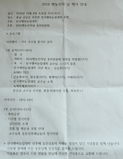 <<À§ »çÁøÀº Çѱ¹º¥Ã³³ó¾÷´ëÇÐ º¥Ã³ÀÎÀÇ ³¯ Çà»ç¿¡ Çѱ¹Çü ģȯ°æ ¹ú²Ü 3³âµ¿¾ÈÀÇ °úÁ¦¸¦ ¹ßÇ¥ÇϰíÀÚ Áغñ¿Ï·áµÈ »óÅ¿¡¼ Àü³¯ ÅÂdzÀ¸·Î µ¿±â´ÔµéÀÌ ºÒÂüÇÏ´Â ¹Ù¶÷¿¡ ÀÏ¿ù»ê²Ü(¾ÈÈ¿Á¾4±â)À» ºñ·ÔÇÑ 4¸íÀÌ ¸ðµÎ ¹ßÇ¥¸¦ ¸øÇÏ°í ´ÙÀ½À¸·Î ¹Ì·ïÁ³¾î¿ä/±â¼öº° Àå±âÀÚ¶ûÀ¸·Î ºÒÀ» ÇÇ¿ì°í ÀÖÀ»¶§ ³óÇùÁß¾ÓȸȸÀå´ÔÀÇ ½ÎÀÎÀ» ¹Þ¾Ò½À´Ï´Ù/±èº´¿ø ȸÀå´ÔÀº Çѱ¹º¥Ã³³ó¾÷´ëÇÐ Ãʺù ±³¼ö´Ô>>