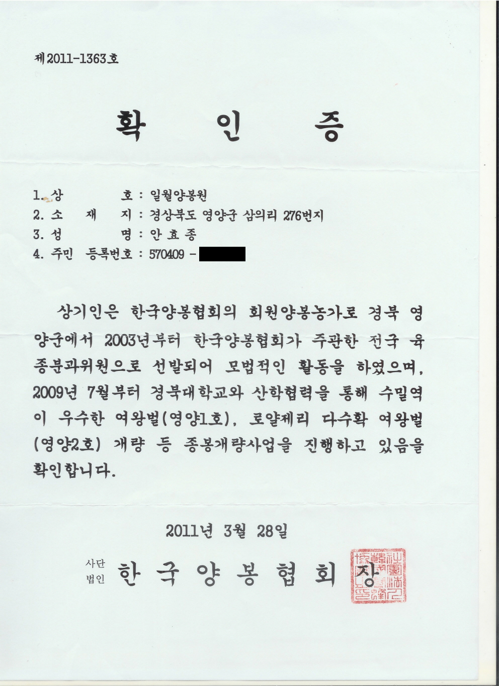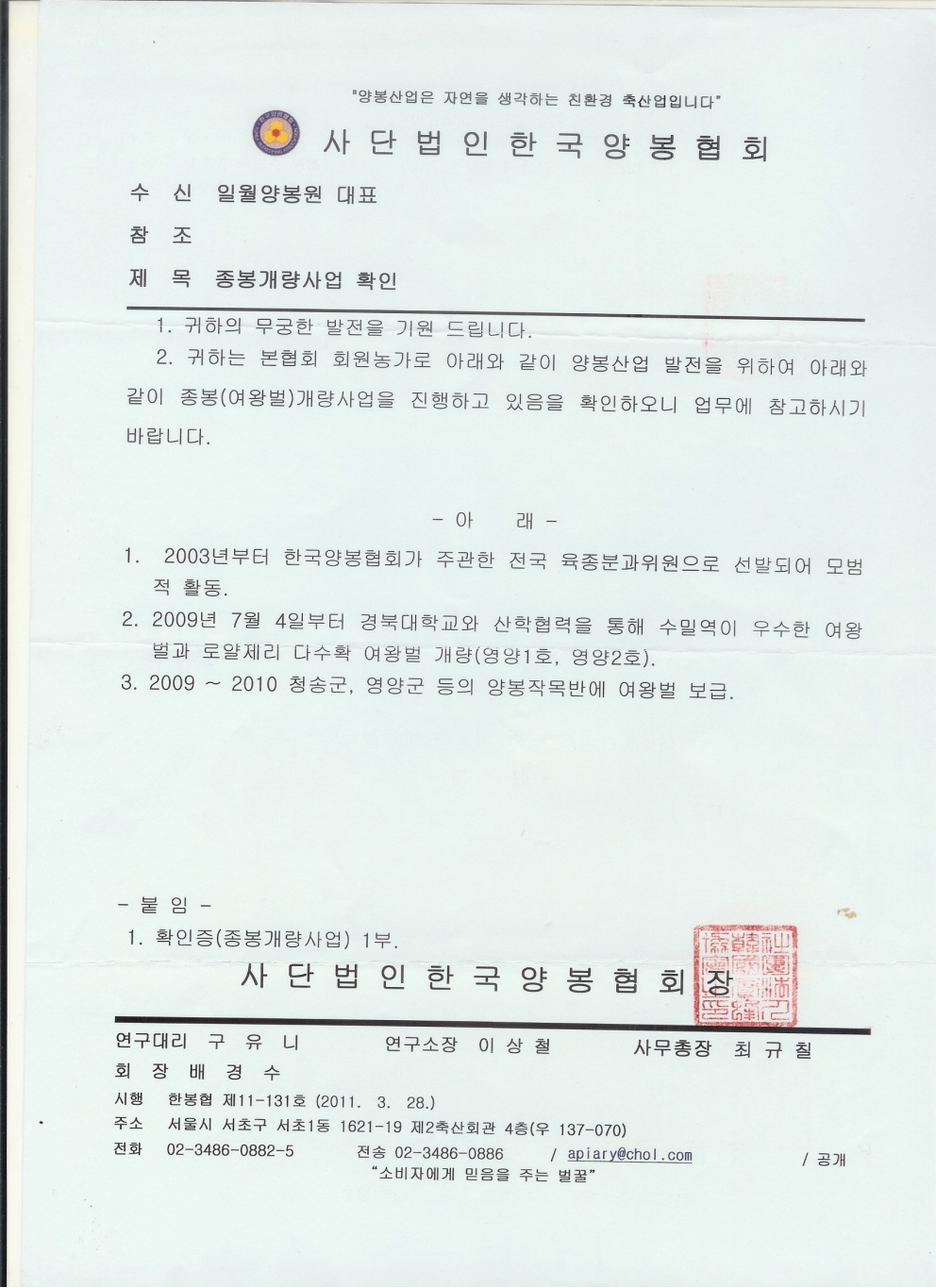 À§ »ó±âÀÚ´Â 2003³âºÎÅÍ Àü±¹ À°Á¾ºÐ°úÀ§¿ø°ú ³ó¸²ºÎ¿Í Çѱ¹¾çºÀÇùȸ°¡ ÁÖ°üÇÑ ¾÷ü¿¡ ¼±¹ßµÇ´Â µî ¸ð¹üÀûÀΠȰµ¿À» ÇÏ¿´À¸¸ç, 2009³â 7¿ù 4ÀϺÎÅÍ °æºÏ´ëÇб³¿Í »êÇÐÇù¾àÀ» ÅëÇØ ¿ì¼öÇÑ ¼ö¹Ð·Â¿Õ°ú ·Î¾âÁ¦¸®¿Õ(¿µ¾ç1È£, ¿µ¾ç2È£)À» °³·®ÇÏ´Â µî °øÀûÀÌ ¿ì¼öÇѹ٠Çѱ¹¾çºÀÇùȸ¿¡¼ À̸¦ È®ÀÎÇÏ¿©Áֽþî Á¾ºÀ°³·®»ç¾÷ È®ÀÎ ½Åû¼¸¦ Á¦ÃâÇÕ´Ï´Ù.