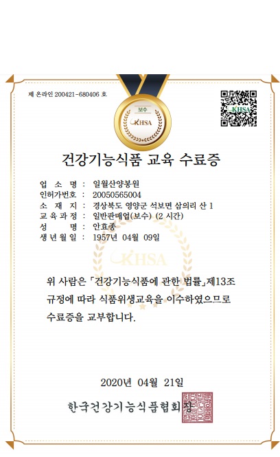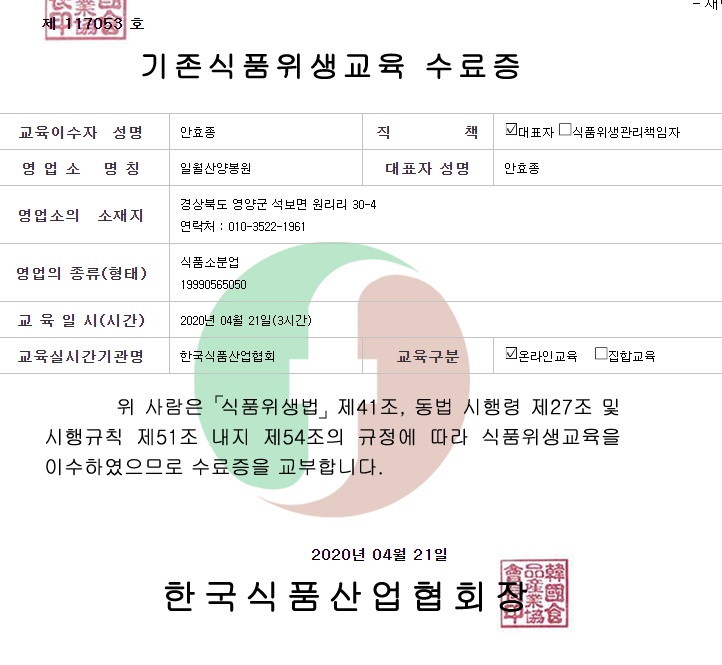 2020³â °Ç°±â´É½Äǰ(ÀÏ¹ÝÆÇ¸Å¾÷), ½ÄǰÀ§»ý(½Äǰ¼ÒºÐ¾÷) ±³À° ¼ö·áÁõ